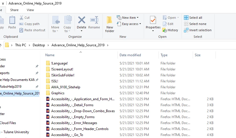 I have downloaded the Advance Online Help Source file and extracted them to my desktop (image below). I would like to upload these files into RoboHelp 2019 Classic to edit, but when I try to open the files in RoboHelp 2019 they are not there. The file type should be RoboHelp, but I don’t know how to get the source files to save as RoboHelp files.