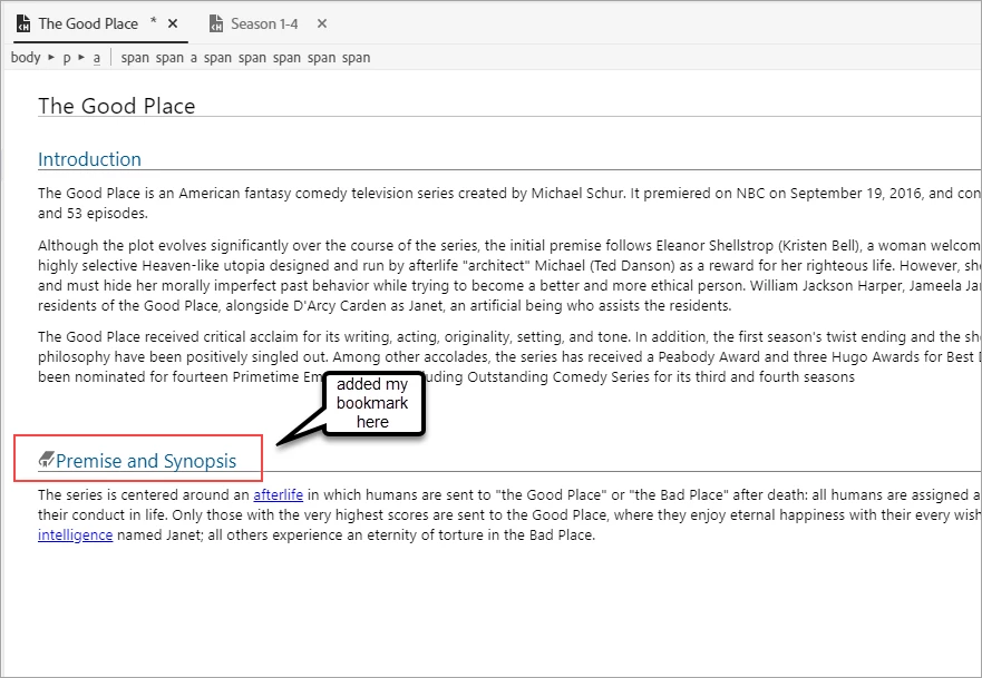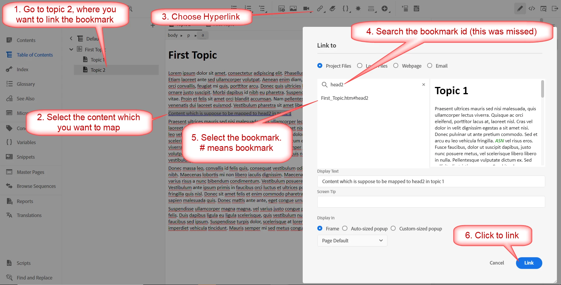 3. Now, create a Head 2 in Topic 2 and add some content to it. Try linking certain terms in the content to the bookmark in Topic 1.
