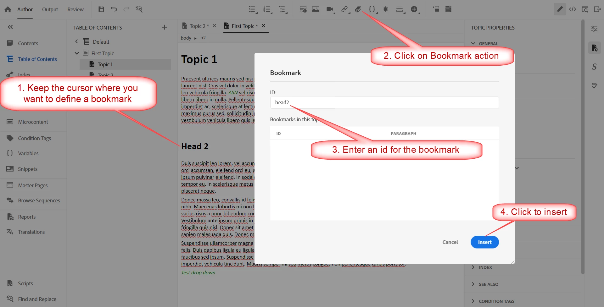 2. Add a Head2 to Topic 1 and insert a bookmark next to the Head2.