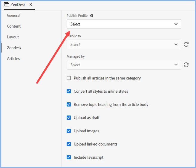 I have a project finished and I need to export it to Zendeck. I've setup Zendesk as a Publisher Profile, but the Zendesk options to no appear in the output panel. There is no way to send the file to them. I've been on Adobe tech support but so far they are no help. It seems like such an easy issue: where is the Zendesk options that match the Adobe Robohelp online help pages?