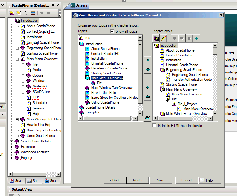 As you can see there is a lot of missing subtopics under the Main Menu Overview topic in the left hand Topics Box. These topics all show up in the ,.chm file. Can anyone tell me how to correct this. I can't add the missing topics to the printed doc. If they do not show up in the Topics Box.