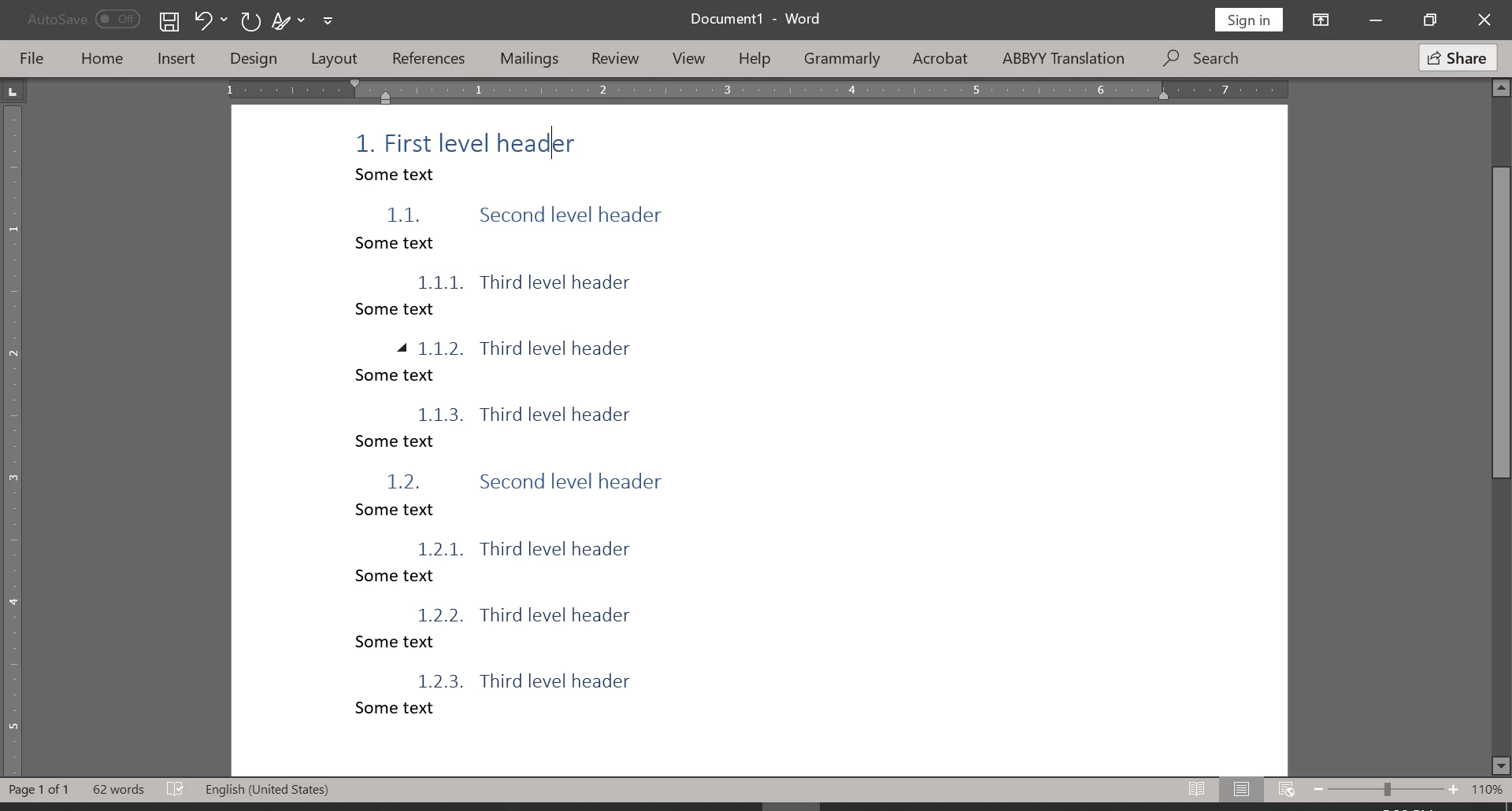 5. Apply H1 again but this time then press tab. You should see your second level.