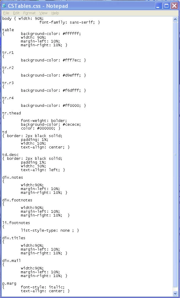 · There is another set of styles applying to the tables, for table rows. There is a “tr” class for the heading and classes for rotating background colors. These child styles appear correct with no problems. Every row in a table belongs to a child class of row styles. In the case of table data styles, most cells require the parent “td” style and only a subclass require the child “desc” style. It’s the “desc” style that isn’t showing up in the chm. Is this a clue?