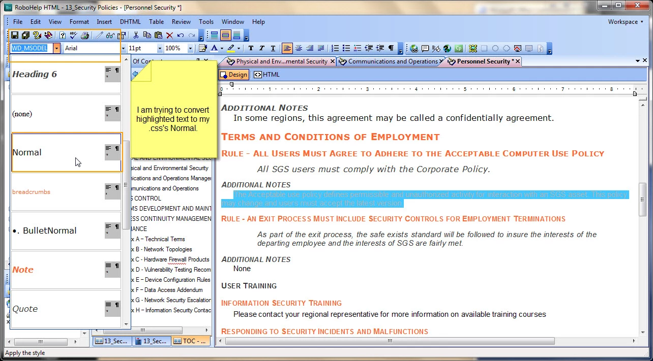 When I am working on a document imported from Word, RH9 is not allowing me to change the styles from the MS_Word styles to my RoboHelp master .css.