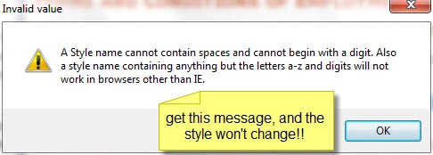 When I highlight a line to be changed, I get the message "Reapply style" - I click on Reapply and then get a message which says:A Style name cannot contain spaces or begin with a digit ... However, I'm not using a style name with spaces or beginning with a digit. My style name is just the standard "Normal". Then RH will not allow the style to change from whatever the "MS_" style is.