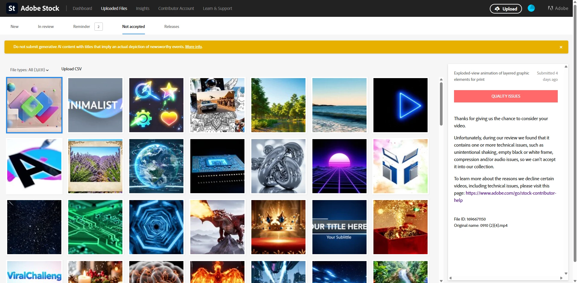 Hello, if my AI photos and AI videos in Adobe Stock are rejected more than accepted for "Similar content in our collection" and "Quality Issues" each time, can my account be damaged? Can my account be blocked or banned? My account has accepted 1869 AI photos and AI videos and rejected 3031.