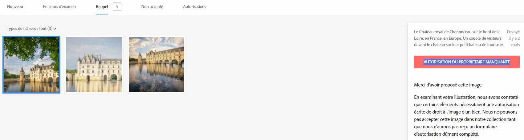 There are 737 pictures of this castle on ADOBE STOCK (chateau de Chenonceau) and i m not sure ADOBE received 737 documents signed by the owner by the contributors !!!