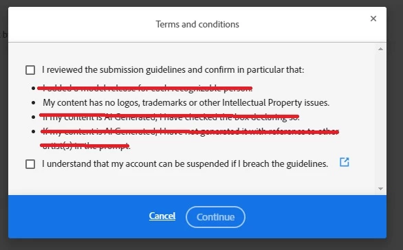 I have attached the new disclaimer screenshot that we all have to agree to when we submit content and I am absolutely fine with most of it but there is a bit that really bugs me. The trademarks and intellectual property, On this one I have had quite a fair amount of rejections. What does Adobe class as Trademark or Intellectual property? As someone who takes mostly aerial shots of cities and urban areas I tend to avoid supermarkets, gas stations, shopping centers and all these type of things. Sometime is just a city skyline with skyscrapers and it still gets rejected under Trademarks and IP, other very similar photo of the same gets approved. Are bridges, churches, castles and so on under IP? Things like Eiffel tower, Golden bridge, London Bridge, Blackpool tower, and so on? Because I can not imagine obtaining a property release be practical for such subjects. I do genuinely avoid having such logos or such on my images and I spend a lot of times scanning and erasing them but there will be times when I may unknowingly submit images that from the reviewers point of view contains IP. Does this mean they can suspend my account, as it says on the disclaimer?