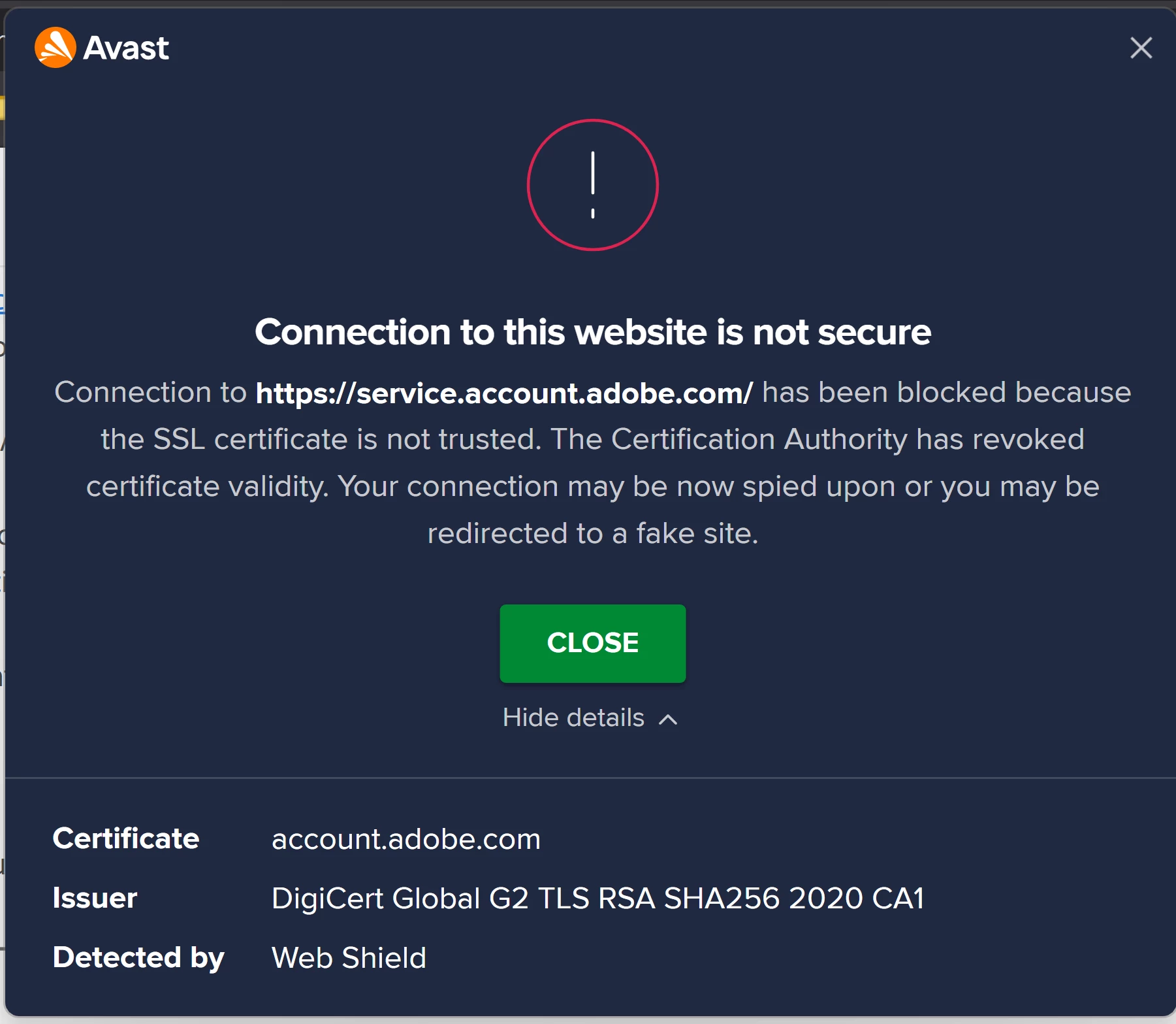 'Connection to http://service.account.adobe.com has been blocked because the SSL certificate is not trusted. The Certification Authority has revoked certificate validity. Your connection may be now spied upon or you may be redirected to a fake site.'
