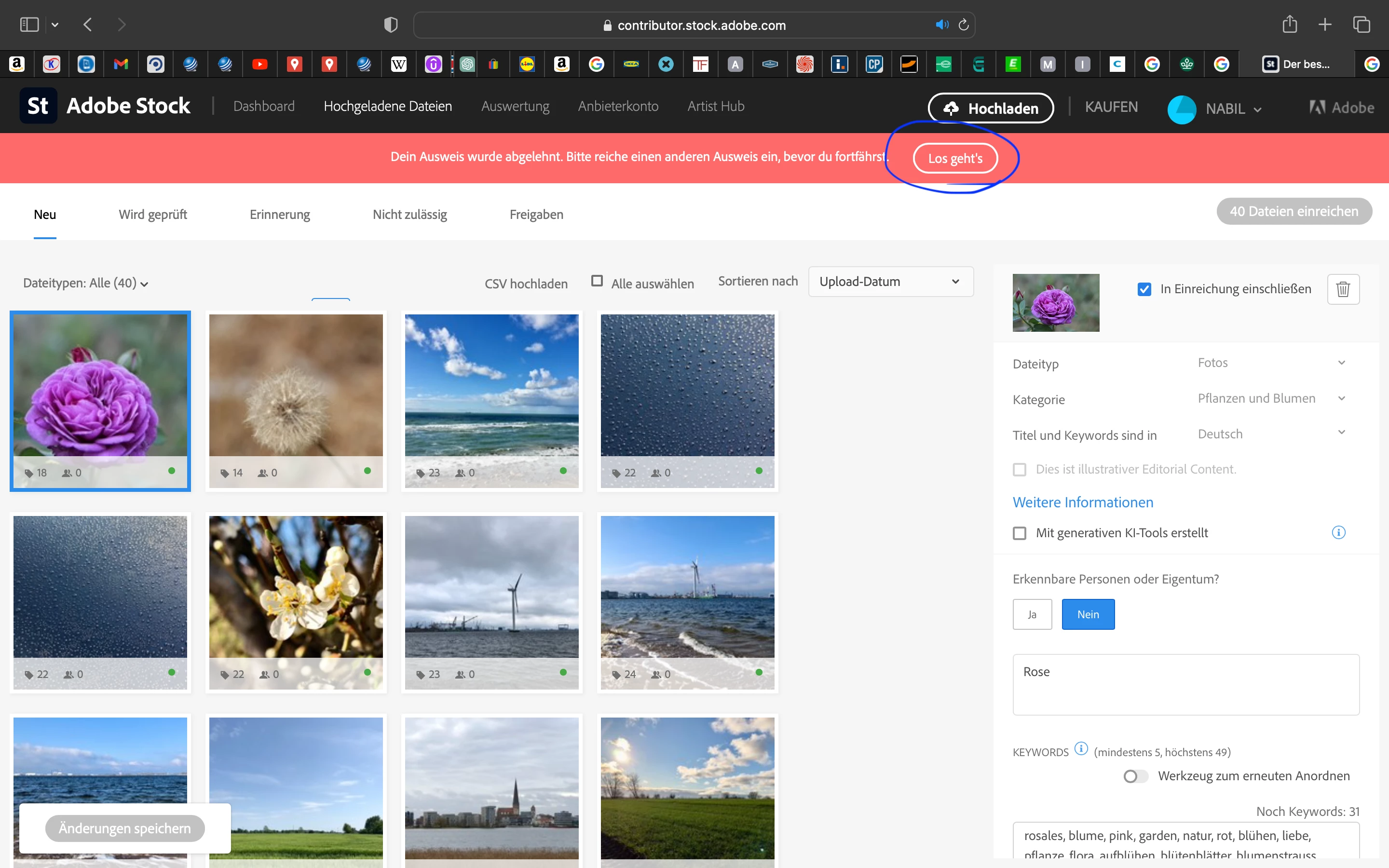 Ich möchte Bilder auf Adobe Stock hochladen. Wenn ich die Bilder hochgeladen habe, kann ich sie nicht zur Veröffentlichung einreichen, da ich keinen Ausweis hinterlegt habe. So steht es zumindest in dem roten Feld über der Seite. Jedoch kann ich keinen neuen Ausweis hochladen, da die angezeigte Schaltfläche kein Hyperlink ist.