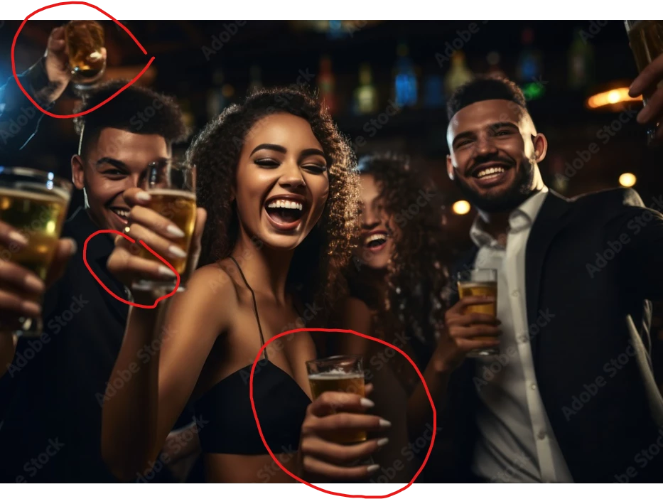 I don't think I've ever seen such a perfectly flawed AI image.  No wonder it got accepted, "A group of middle-aged African American friends laughing at a levitating glass of wine" is the new niche, haven't you heard?