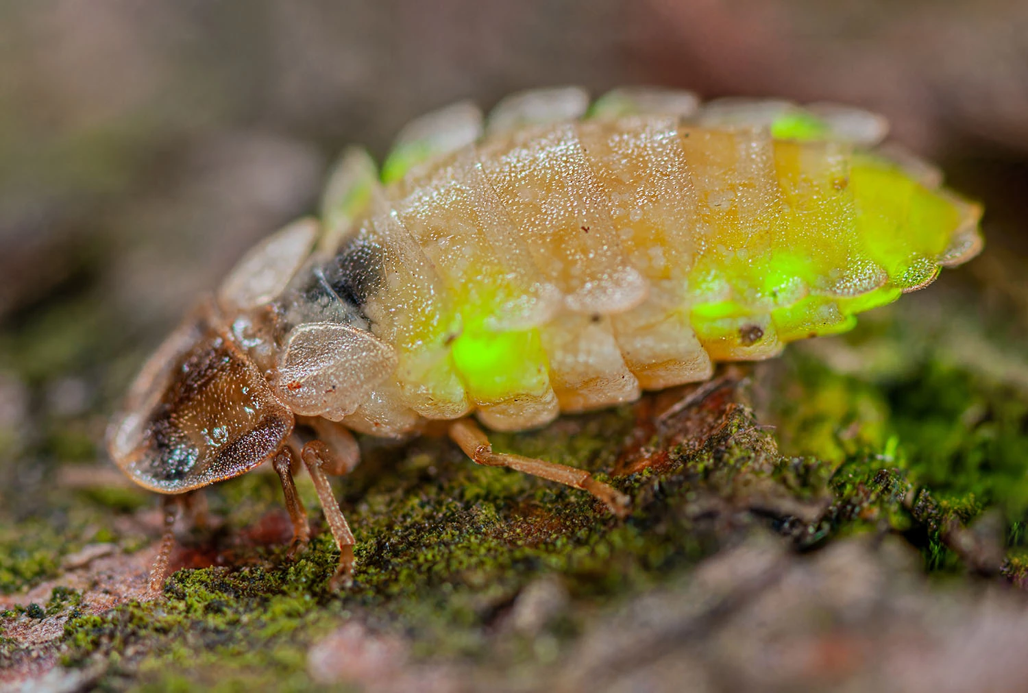 Die Belichtungszeit betrug aufgrund der Dunkelheit bis zu 10 Sekunden, der grüngelbe Farbstich kommt durch das vom Insekt erzeugte Licht! Ich habe extra auf eine künstliche Lichtquelle verzichtet um genau das zu dokumentieren!