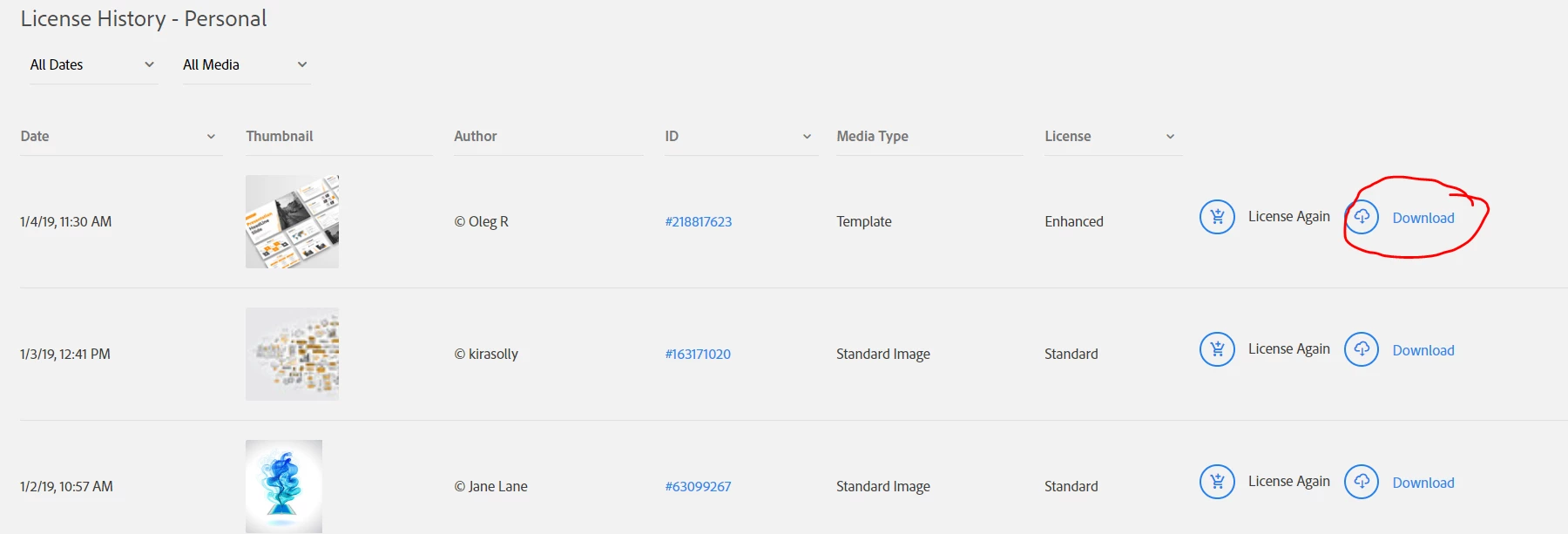Is there a way to view images that you have downloaded in the past and to redownload them from the Adobe Stock website?