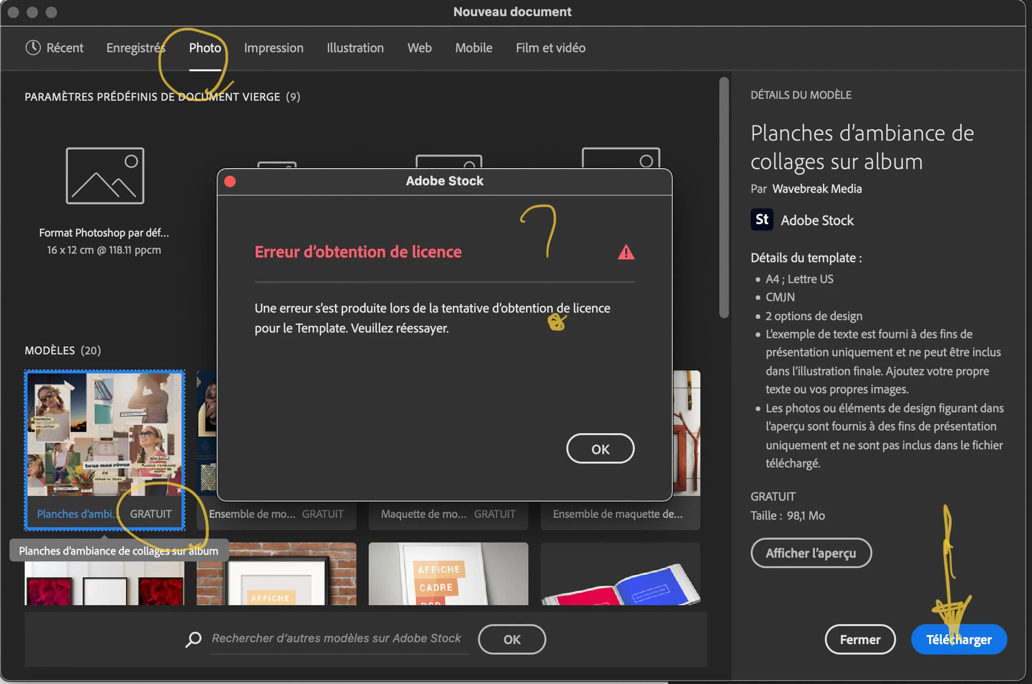 Le 06 mai 2022 PS 23.3.1 Nouveau document en choisissant un modèle proposé par Adobe, Erreur d'obtention de Licence.
