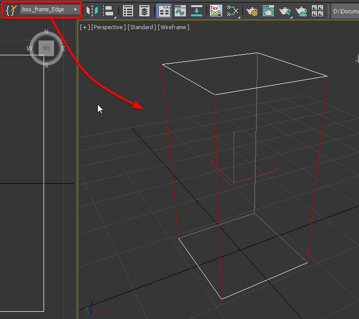 The selection set in 3ds Max, note one of the vertical edges is not included in the set.