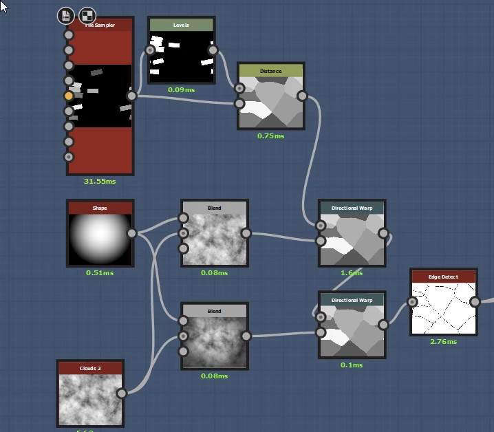 2. Feed that into directional warps nodes to give some variation to the edges then into an edge detect node so you have the first layer of veins
