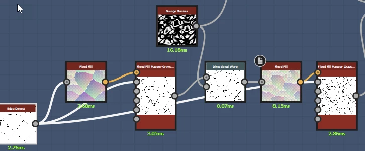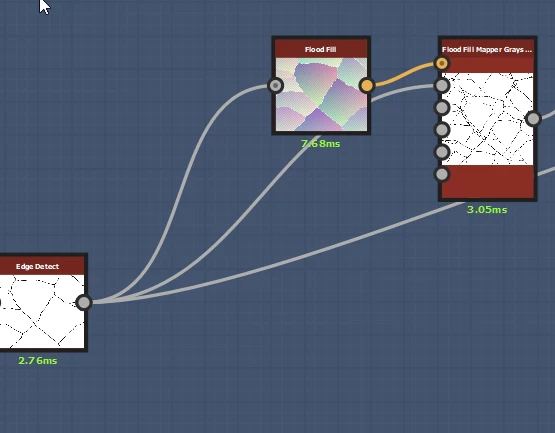 3. Take an output from the edge detect node and feed that into a flood fill and flood fill mapper grayscale. This will give you the next layer of finer veins within the first set