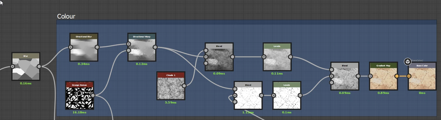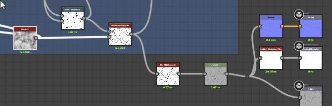 5. From the directional warp above add a slope blur greyscale to get a bit of width variation in the lines and use that to feed the height and normal nodes (I did not include the third level of fine veins in the height map)