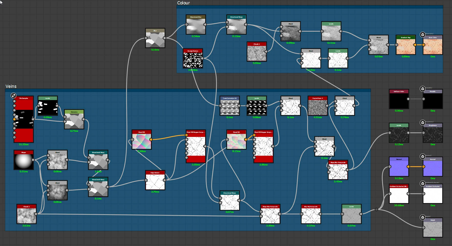 4. Use a directional warp node and some grunge damas to twist the veins then repeat the flood fill and flood fill mapper greyscale to get a third layer of veins