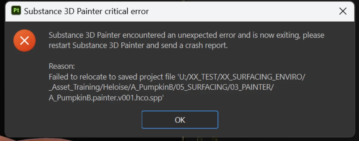 We have this critical error message "Substance 3D Painted encountered an unexpected error and is now exiting, please restart Substance 3D Painted and send a crash report.