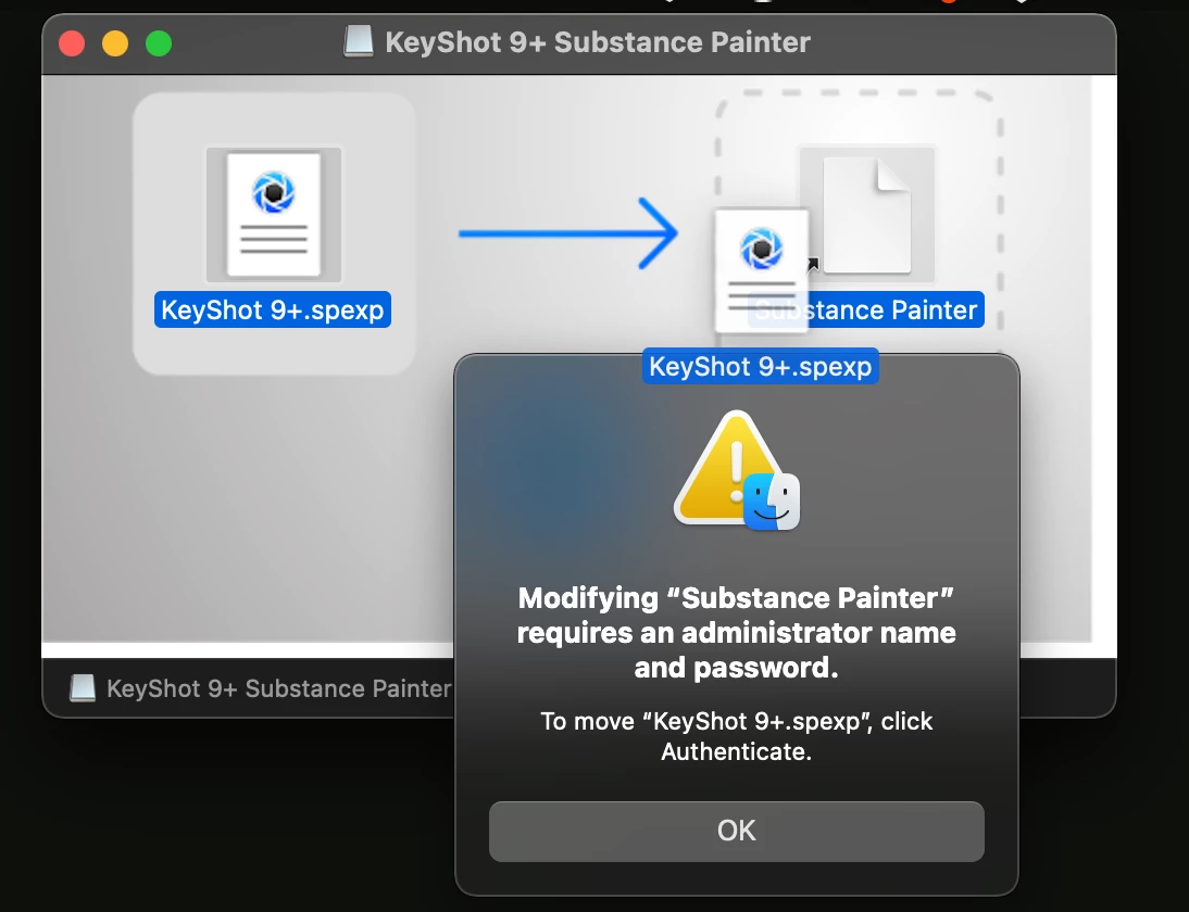 While trying to instal the KeyShot 9+ into Painter, i get a massage to enter password for addministration permit. [macOS 11.6.5]