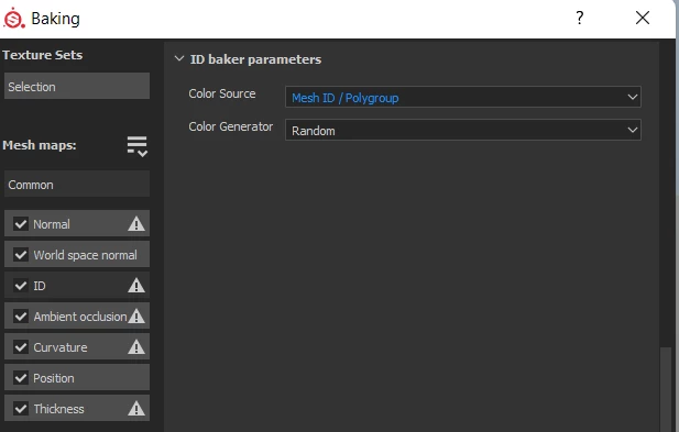 Next step, baking. Setting the ID to have the color source "Mesh ID/Polygroup" and Color generator to be Random.
