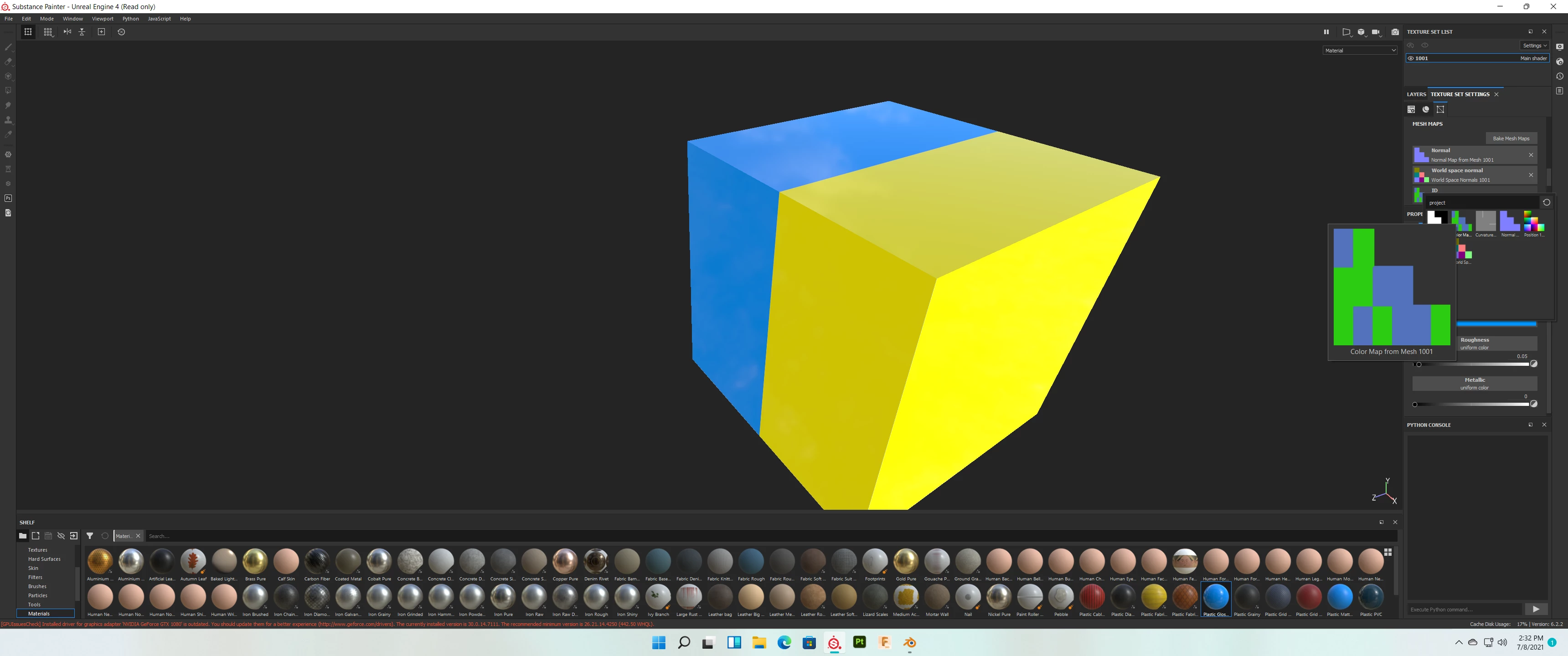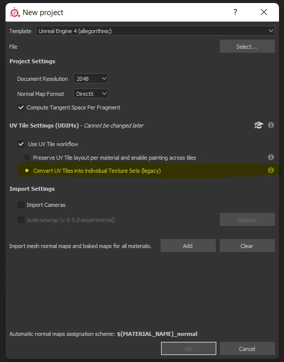 Step 2. Load the file in Substance Painter 2020 with the option to CONVERT UV TILES INTO INDIVIDUAL TEXTURE SETS (legacy) because I need for the object, no matter how many separated meshes it has, to have only ONE texture set at the end (much better for game engines than to have multiple texture sets)