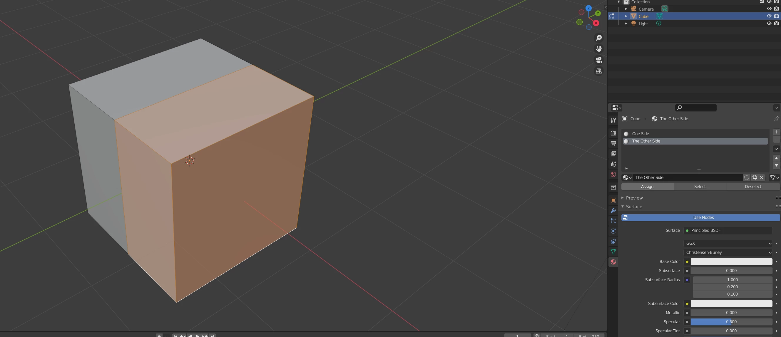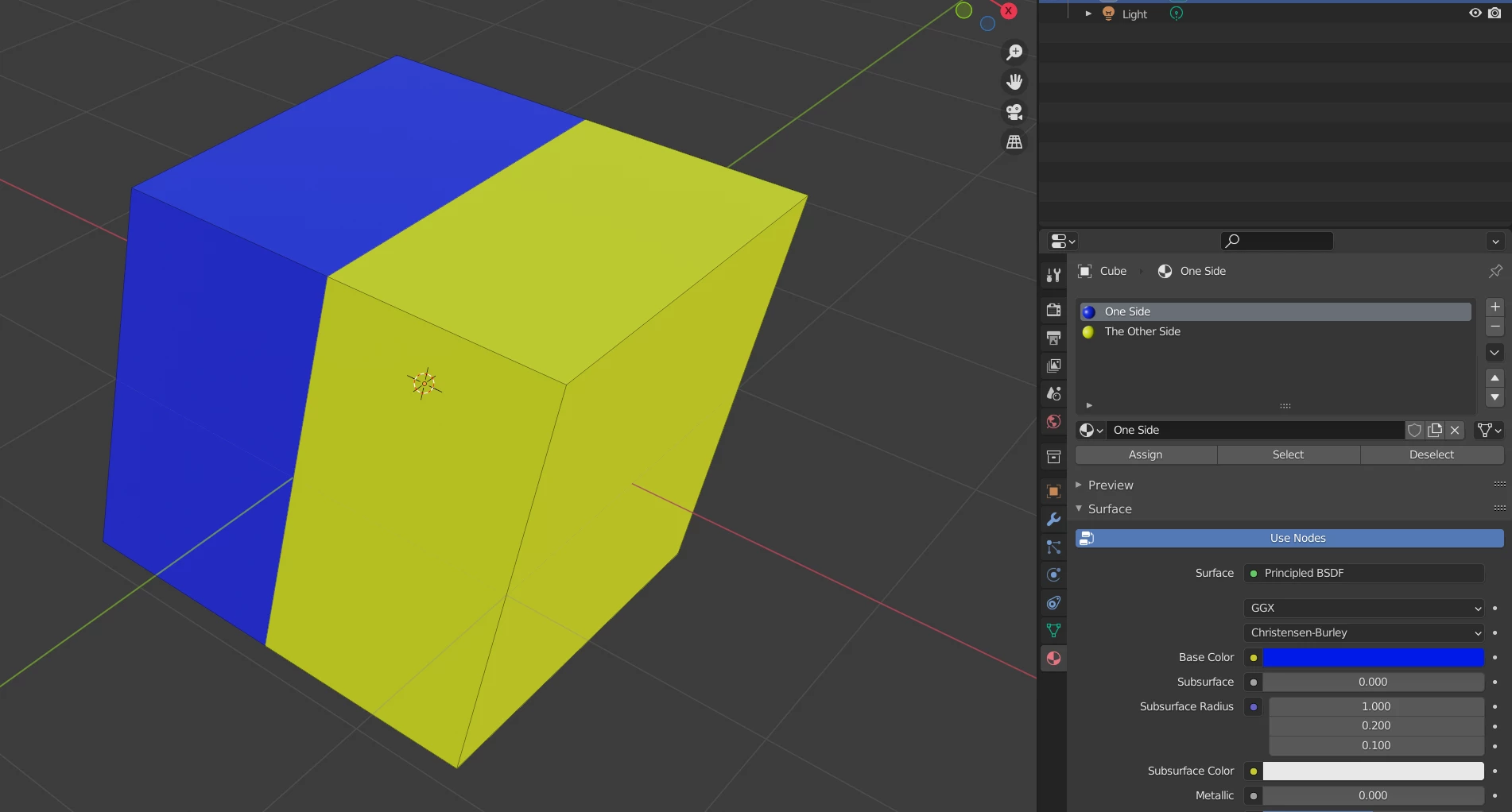 A single mesh, a cube, one part with one material, the other part with a different material.