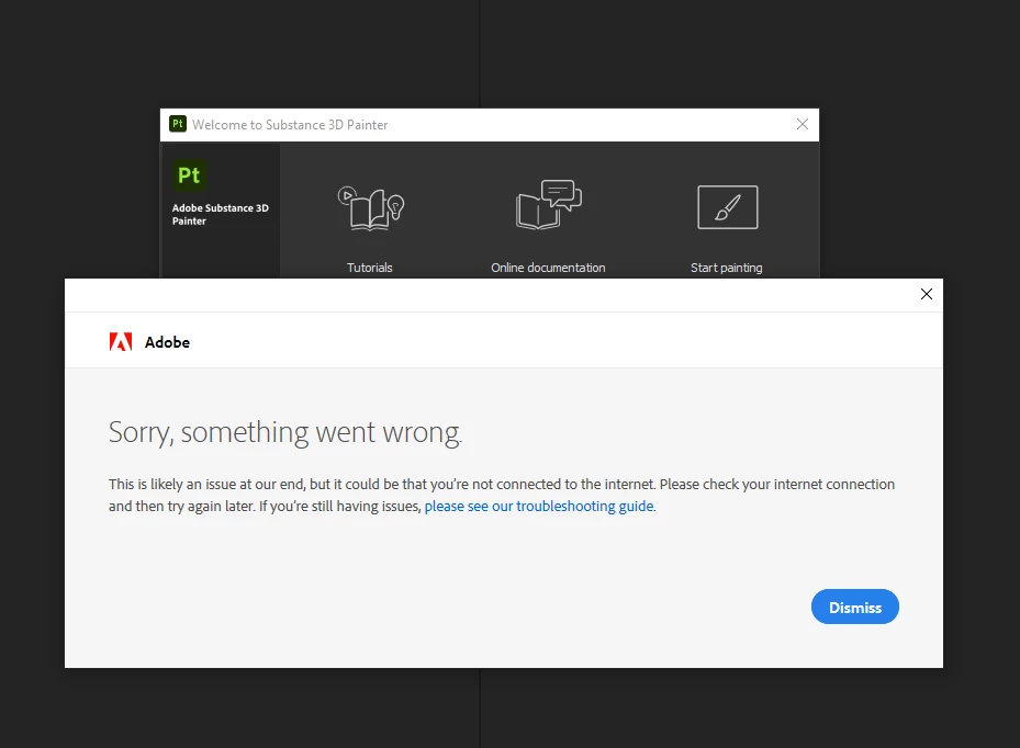 Substance 3D Painter "Sorry, something went wrong." The app failed to connect to the Adobe servers?