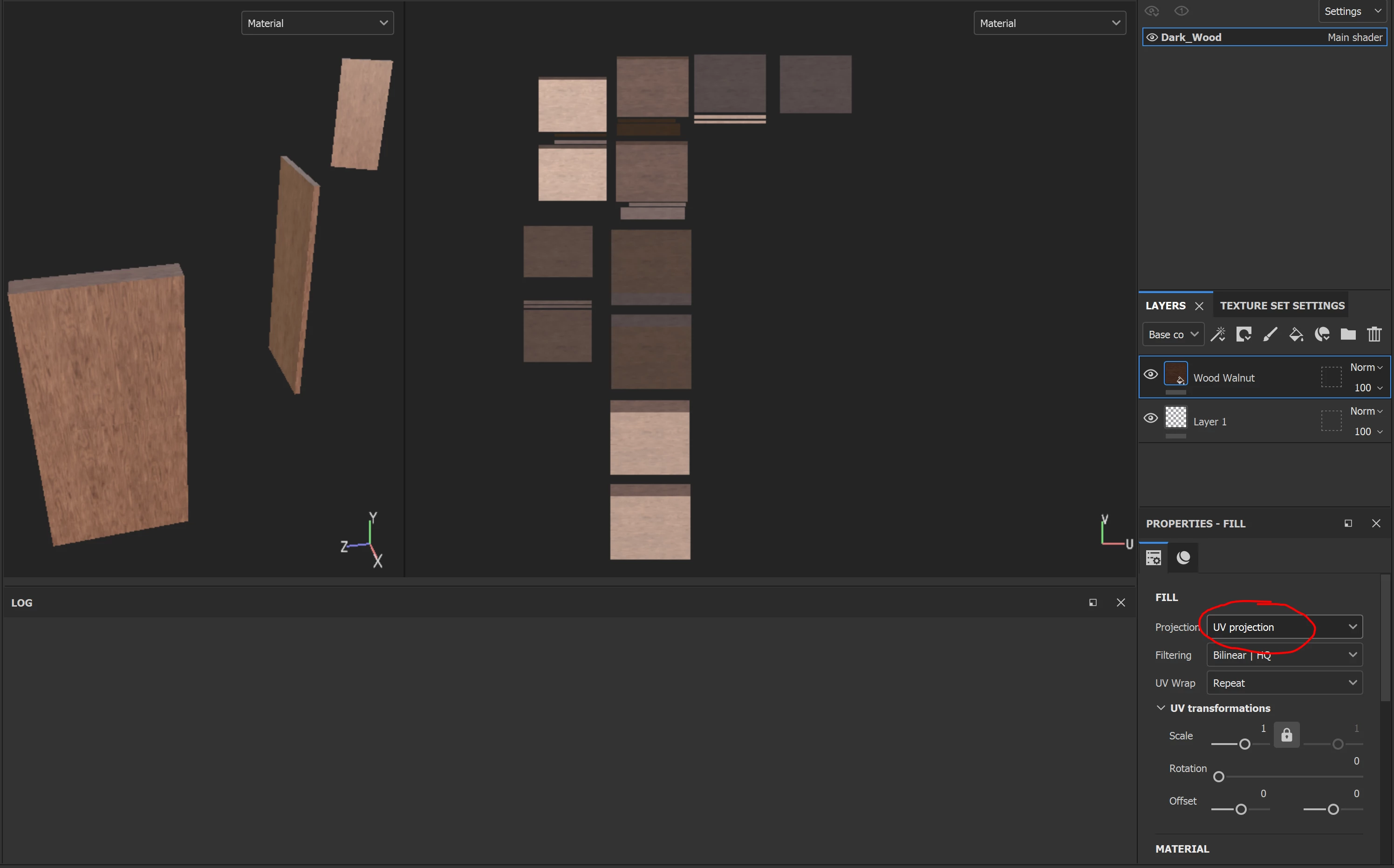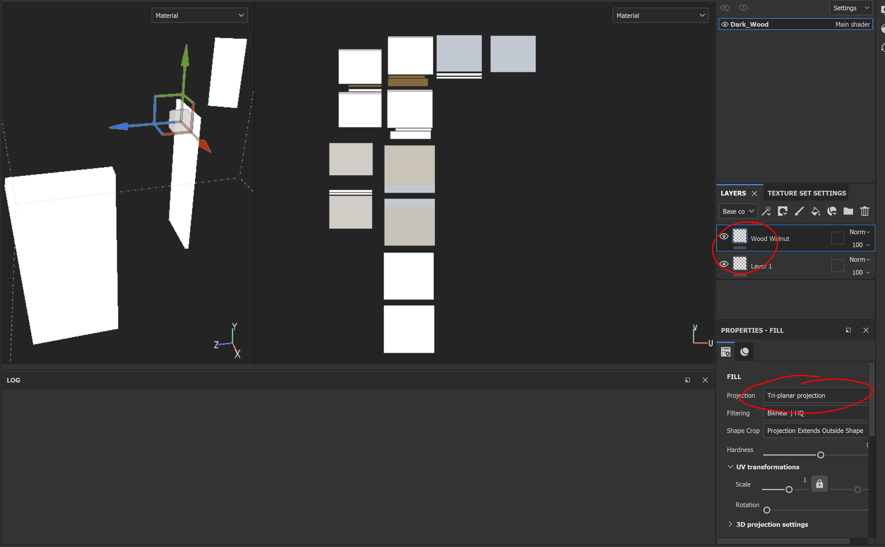 Here I have 3 rectangle shapes, very basic. They are cut into more that one UV, so i need to use tri planar to even out the wood grain. As soon as I chose the tri planar from the drop down, it just removed the material, and the mesh turned back to white again.