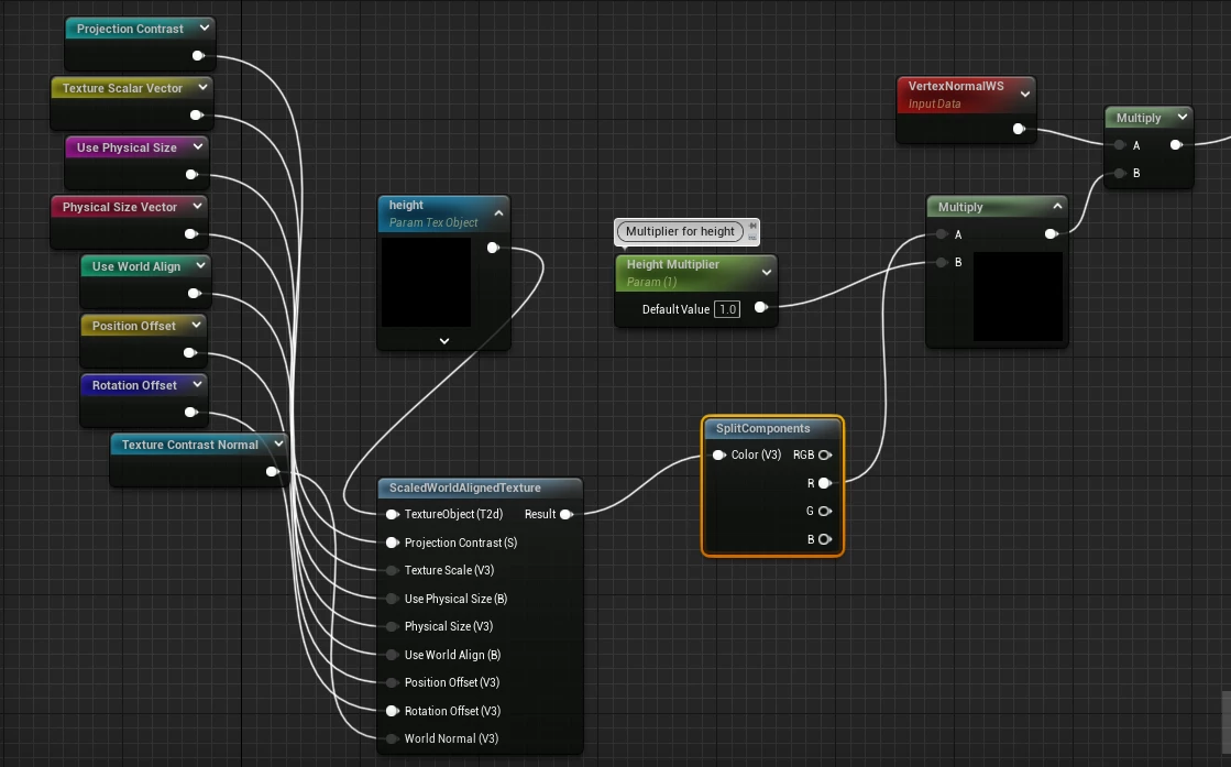 Hi @SwogDog, thanks for reaching out! In this case the issue is happening because all of the channels are being used for height when we only need the Red chanel. You can add a SplitComponents node after the ScaledWorldAlignedTexture node and send only the Red output to Multiply. After saving changed you should see displacement applied correctly in every axis.