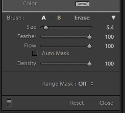 - You can adjust the size of the Adjustment Brush in the Size slider.