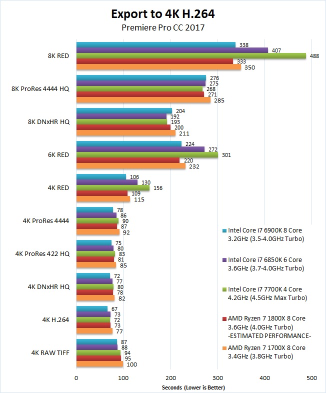 the benchmark chart below shows that with red footage the amd ryzen 8 core is able to keep up with the intel 8 core. most likely from the red footage being able to use all 8 cores. for the rest of the media types it appears we have the typical adobe/premiere problem of poor multi-threading, which shows all of the cpu's turn in somewhat similar times. another benchmark shows the amd 8 core ryzen cpu perform like the intel 6 core while exporting to 4k h264​​ with source media other than red footage. that might explain why several other reviews show the amd 8 core perform like the intel 6 core in premiere. amd's ryzen might be doing worse with h264 exports as a result of how the h264 codec premiere uses is coded, since the 4k dnxhr export​ benchmark shows the amd 8 core ryzen cpu keep up with the intel 8 core. i think the puget benchmarks are all at stock cpu speeds, so an overclocked intel cpu could possibly pull away from an overclocked amd ryzen in these benchmarks.