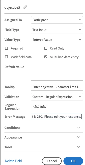 I want to limit characters for different fields. I tried doing a combination of text and alphanumeric string validations, but it wouldn't validate correctly when testing the form if I added spaces between words, so now I am trying to do it with a custom expression, but that isn't working either. I saw something similiar to the syntax below on another post, but it isn't working for me. The format below is what I am using. What am I doing wrong? Also, do I need to add 'signer1', 'signer2', or 'anyone' to validate the signer or does that take care of itself by who I assign the field to in the options box? Lastly, do I need to change the syntax below for text string vs alphanumeric string?