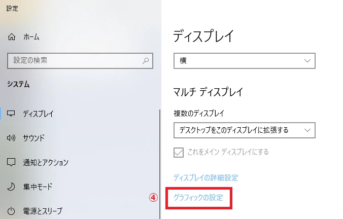 ④ "マルチ ディスプレイ" 内の [グラフィックの設定] をクリック