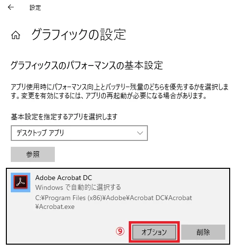 ⑨ Acrobatの箇所で、[オプション] をクリック