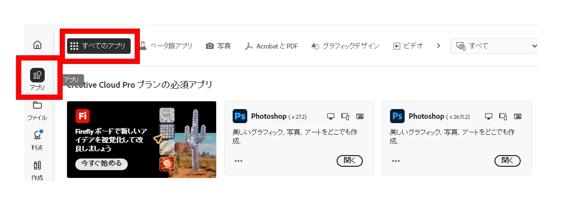 複数バージョンのアプリケーションがインストールされている場合は Creative Cloud の