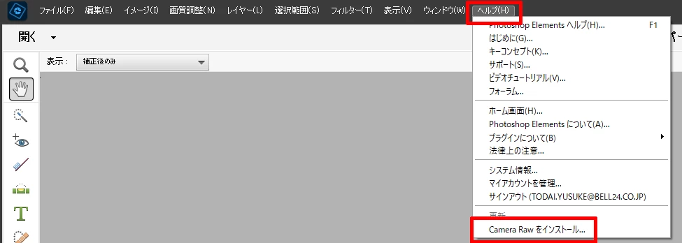 1.画面上部のヘルプメニューより「Camera Raw をインストール」を選択
