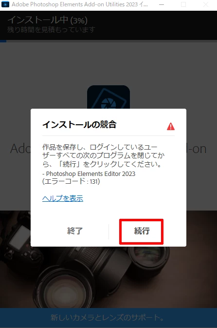 3.Camera Raw をインストールするため、以下表示にてPhotoshop Elements の終了が求められます。起動しているPhotoshop Elements を終了し「続行」を選択ください