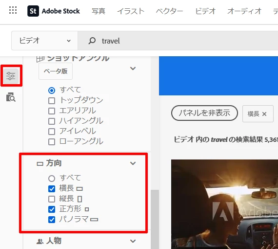2.検索ボックスにキーワードを入れ素材の検索をします。3.画面左上のフィルターアイコンをクリックし「方向」にて「縦長を除いた項目にチェック」を入れます。