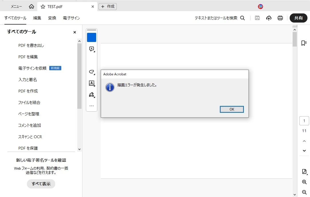①pdfファイルをクリックして開こうとすると、「描画エラーが発生しました。」とポップアップウィンドウが開き、pdfファイルが開けません。ファイルに依存するわけではなく、すべてのpdfファイルで同様の結果になります。