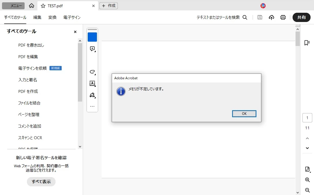 ③メニューをクリックすると、「メモリーが不足しています。」とポップアップウィンドウが開き、「OK」をクリックすると再度同じ「メモリーが不足しています。」が出続けて11回目の「OK」クリックで出なくなります。