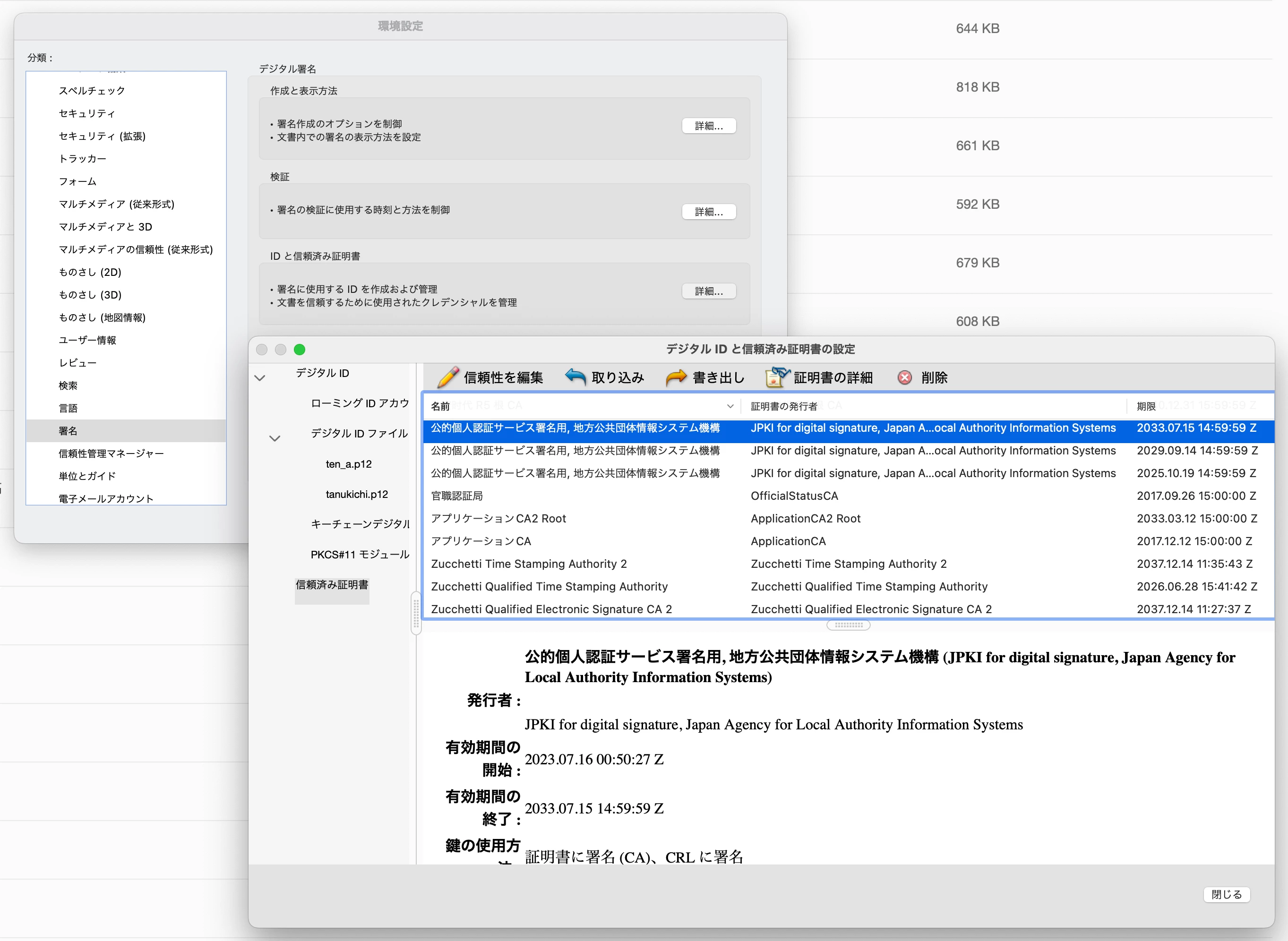 ということで、マイナンバーカードによる署名はJPKIのルートが通っていない為に検証に失敗します。これを正常に検証できるようにするにはJPKIサイトから署名用認証局の自己証明書をダウンロードしてAcrobatに読み込みます。