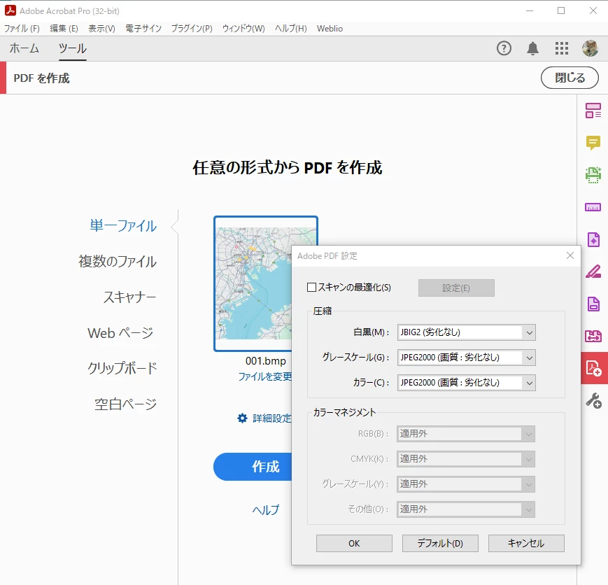 ご返答ありがとうございます。BMPファイルを右クリックして「AdobePDFに変換」になります。adobe acrobatからツールを選択し「PDFの作成」からでも同様の結果になってしまいます。