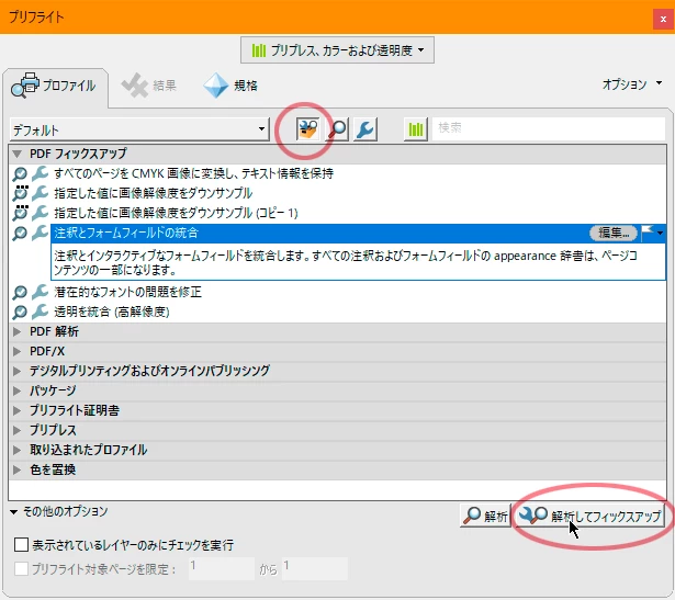 ツール内に「印刷工程」があり,その中の「プリフライト」メニューを選択すると,現在開いているPDFファイルの解析や問題点の修正等(フィックスアップ)を行うことができます。