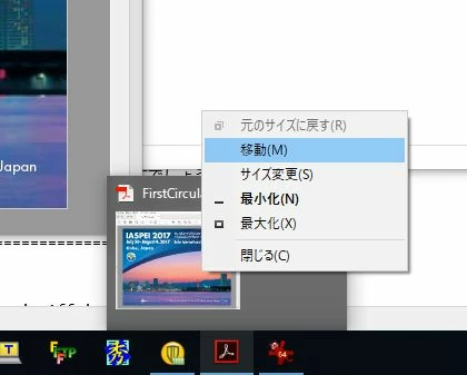 ウィンドウズのタスクバー上で、Acrobatのアイコンにマウスカーソルを当てると出てくるサムネイルを右クリックすると、「元のサイズに戻す」「移動」「サイズ変更」「最小化」「最大化」などのメニューが出ますが(画像参照)、ここで「移動」を選択して、カーソルキー(矢印キー)を用いてウィンドウを移動させようとしても、何かのファイルを開いている場合、動いてくれません(空窓だと動く)。どこか設定を変更をすれば移動できるようになるのでしょうか。ご教示いただければ助かります。