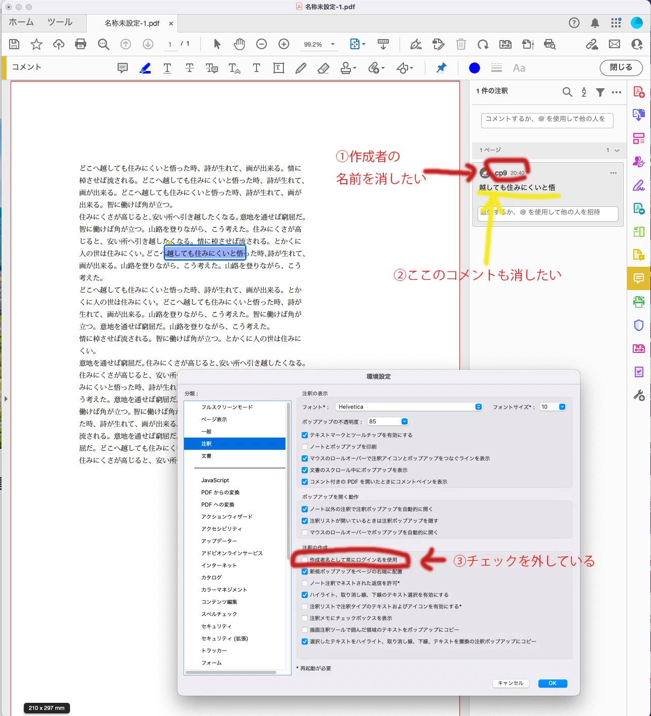 PDFでコメント付ける際に、作成者の名前を消したいのですがわかる方おりますか?