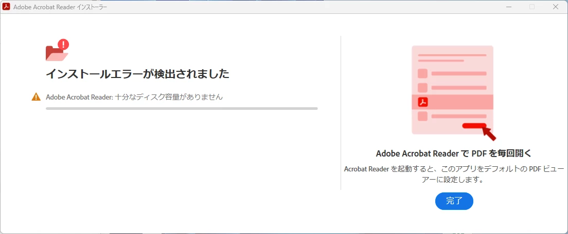 十分な容量があるが、容量不足と表示されてAdobe Acrobat Readerをインストールできない