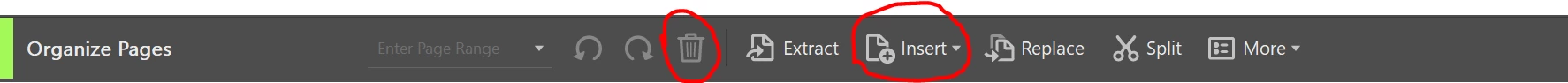 結合されたAcrobatDCのPDFのバインダーの1ページ内に間違いがみつかった時、「ページの整理」でページを削除した後、新しいページを挿入したいのですがどのように操作したらよいですか?