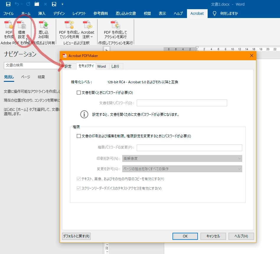 Word の Acrobat タブにある PDFMaker 環境設定のセキュリティ設定はどうなっていますか? 確認してみてください。